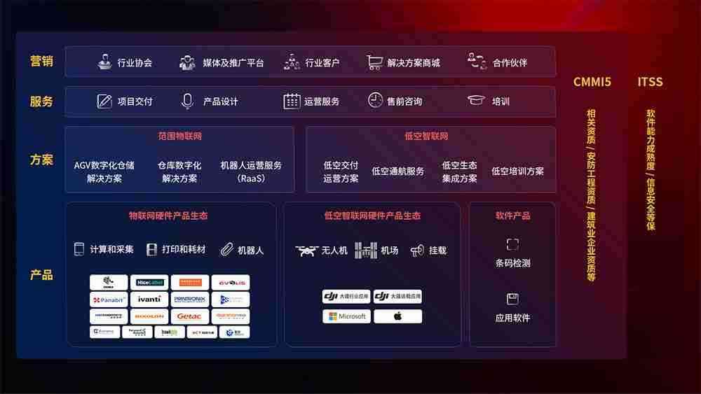 聚合国内外先进的物联网硬件产品品牌,,,聚焦数字化仓储、、机器人运营、、低空智联网等领域,,共同打造适合客户业务场景的解决方案并提供交付服务